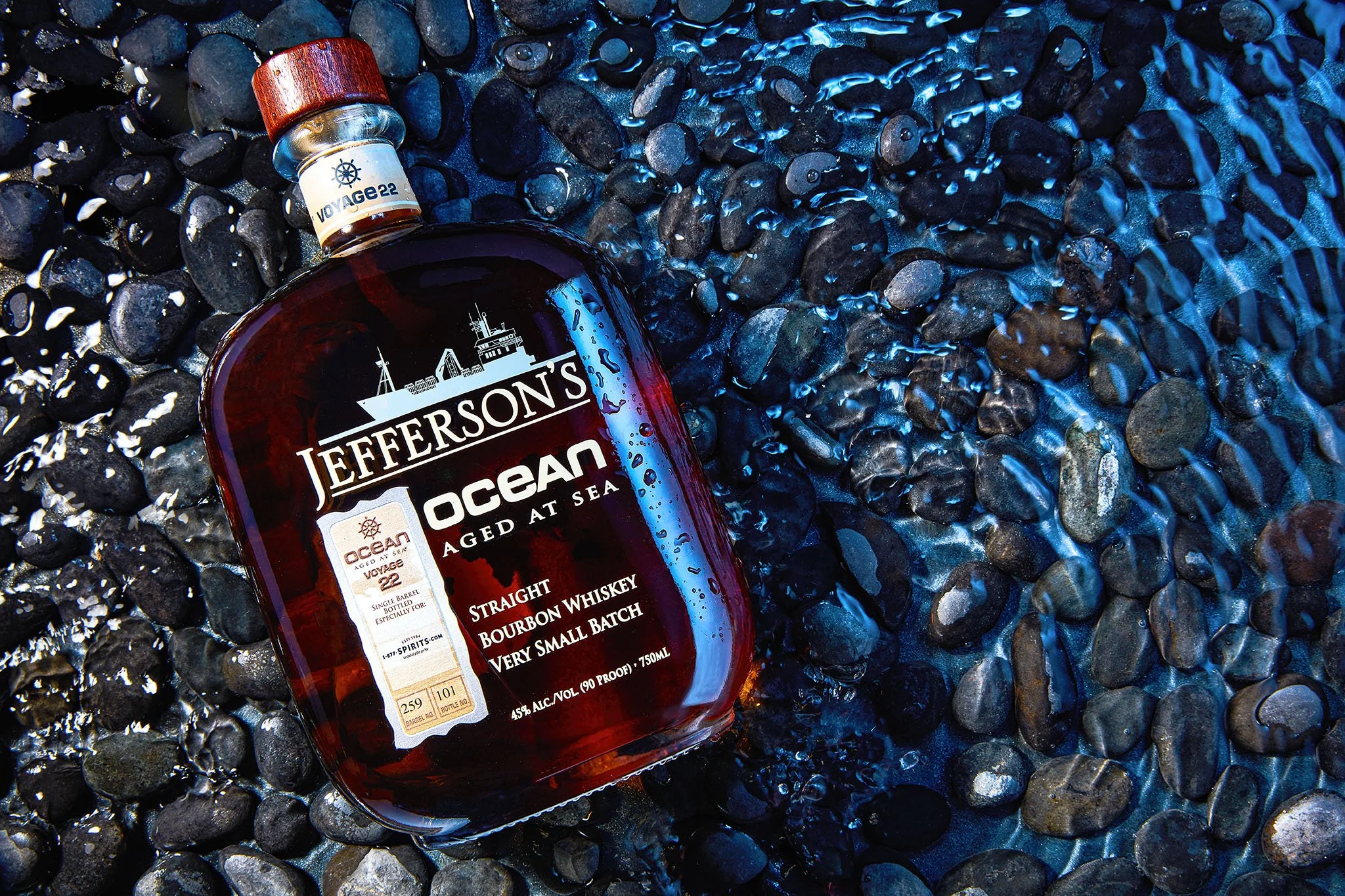 Jeffersons ocean, aged at sea, straight bourbon whiskey, very small batch, water, bourbon bottle in waves, jason barnes, two16 photography